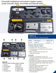 King Innovation is proud to offer the latest in locating technology. Specifically designed for irrigation professionals, the King AL is an electrical tester for quickly and safely locating and identifying underground valves and wires. Trace wire paths, determine depth, and identify potential wire breaks, wire nicks, and solenoid valves when troubleshooting with the King AL. The King AL is a great everyday instrument for outdoor contractors who need a rugged, yet lightweight locating system.